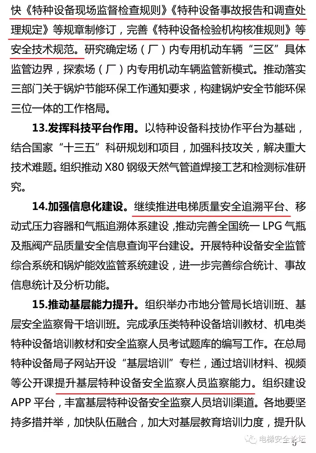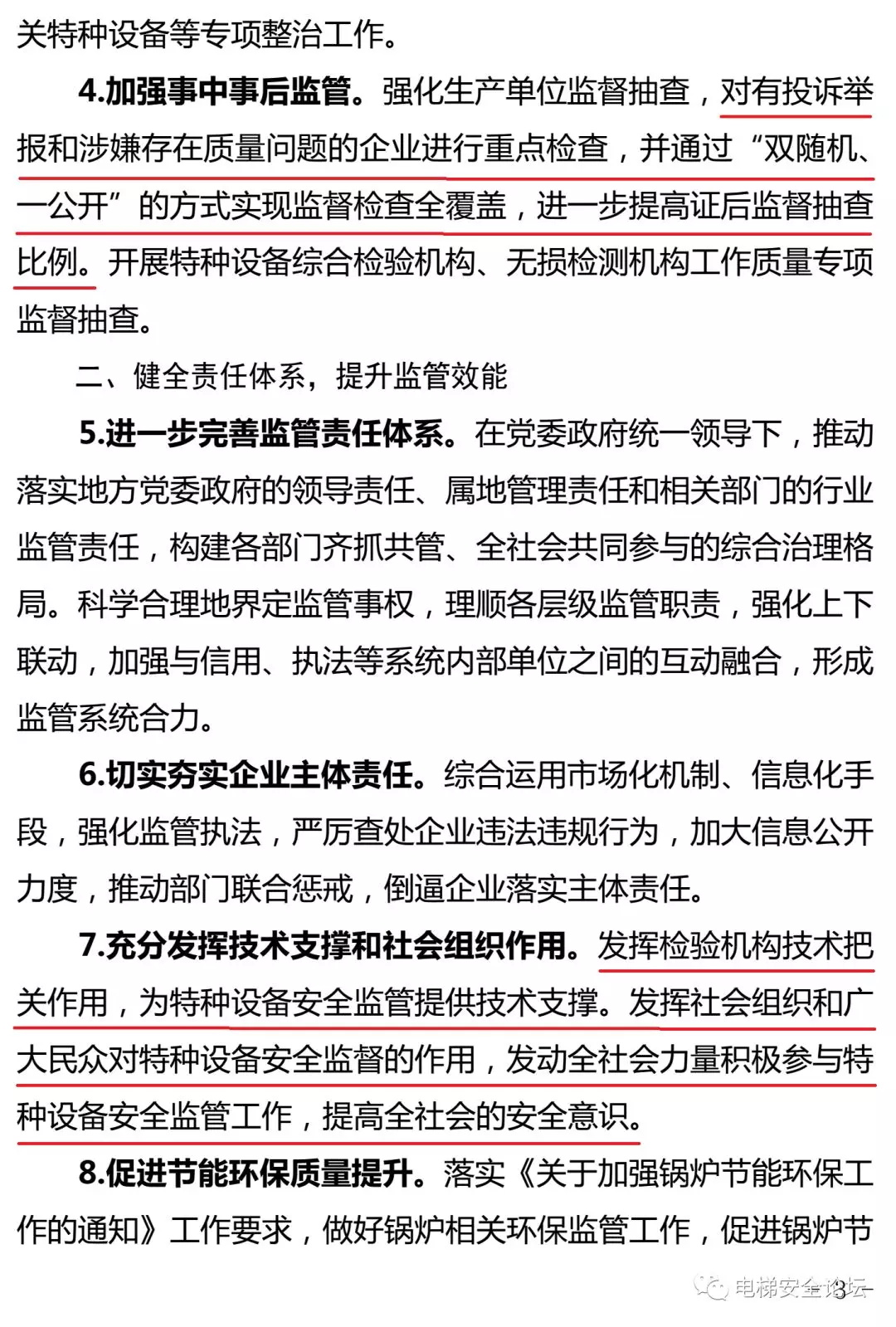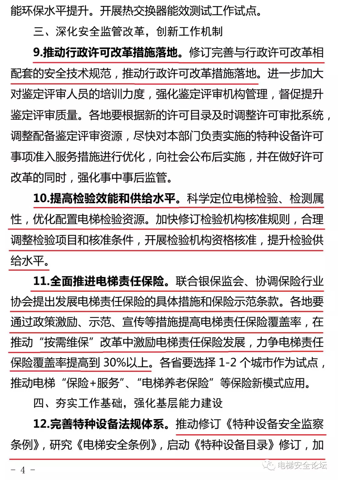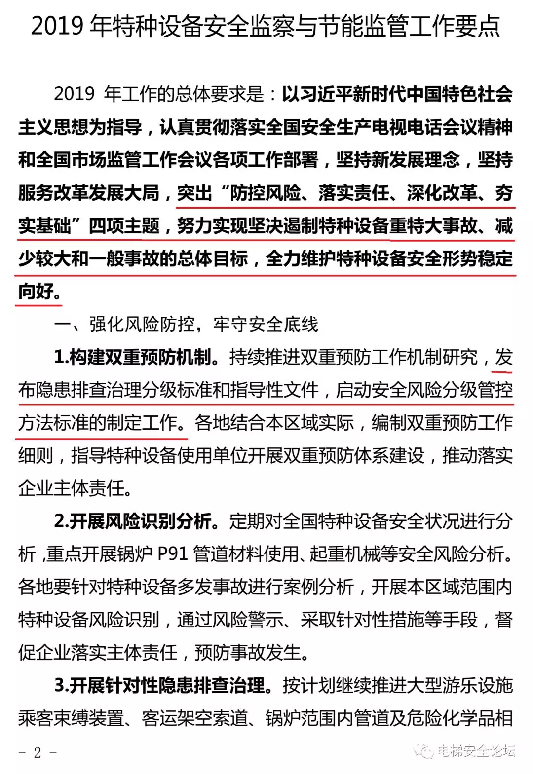 與那首曾經(jīng)【90后們可能不一定聽(tīng)過(guò)】唱遍大江南北、曾經(jīng)很火很火歌曲的歌詞“2002年的第一場(chǎng)雪,比以往時(shí)候來(lái)的更晚一些”不同,今年的《特種設備安全監察與節能監管工作要點(diǎn)》似乎比往年來(lái)的更早一些。粗略讀完,第一感覺(jué)是任務(wù)艱巨、干貨滿(mǎn)滿(mǎn),同時(shí)也深感總局特種設備安全監察局的各位領(lǐng)導工作真是不容易,肩負重擔、工作壓力可想而知,那可不是一般的大??! 比如在工作要點(diǎn)中明確: 修訂完善與行政許可改革相配套的安全技術(shù)規范,推動(dòng)行政許可改革措施落地。 科學(xué)定位電梯檢驗、檢測屬性,優(yōu)化配置電梯檢驗資源。加快修訂檢驗機構核準規則,合理調整檢驗項目和核準條件,開(kāi)展檢驗機構資格核準,提升檢驗供給水平。 在推動(dòng)“按需維保”改革中激勵電梯責任保險發(fā)展,力爭電梯責任保險覆蓋率提高到30%以上。 推動(dòng)修訂《特種設備安全監察條例》,研究《電梯安全條例》,啟動(dòng)《特種設備目錄》修訂。。。。。等等。 不再往下羅列下去了,詳細內容大家就慢慢仔細看吧!其中任何一項都是艱巨的任務(wù)??!